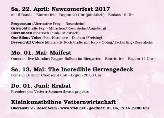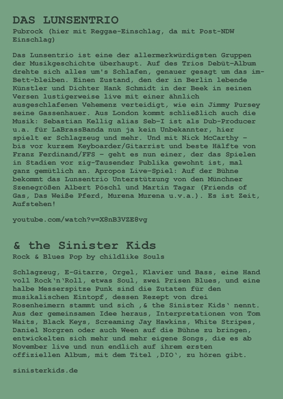 Die genaue Spielreihenfolge der Bands wird beim Newcomerfest vor Ort bekannt gegeben.